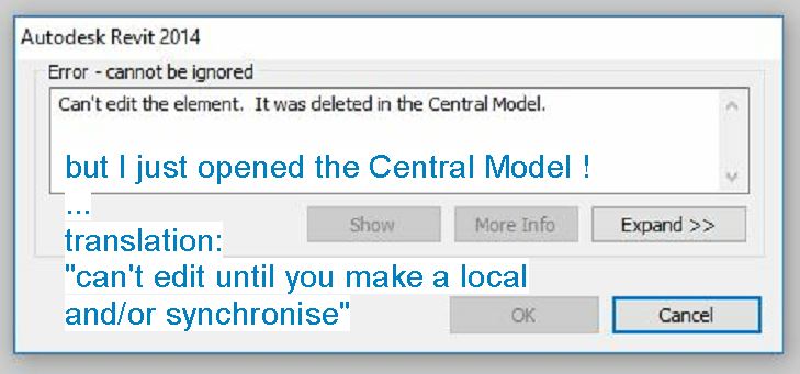 Actually the element may well still be there. The little robot that sits inside Revit can’t possibly be programmed for everything that might conceivably go wrong. Maybe it would be better if it just said, “can’t edit that until you synchronise”. Then you would know what to do, instead of going “who deleted my stuff !!” I’ve only come across this when I open a workshared file and (very naughtily) try to do something before creating a local. Or if I open from a local, trying to do something before reloading latest. Either way, I’m taking a risk in the first place, but then, life is full of risks.