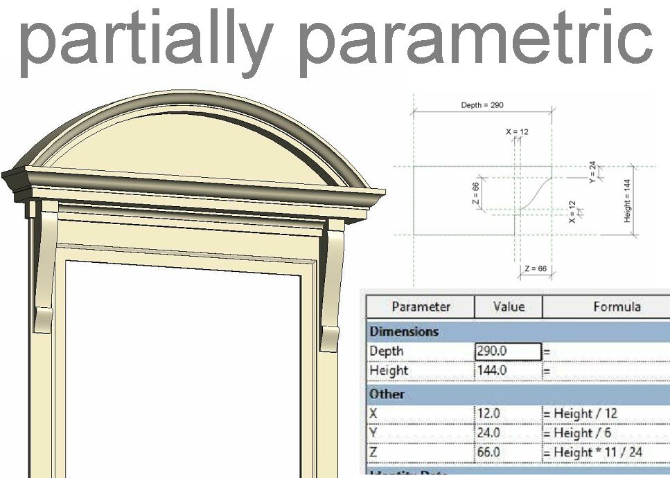 A fully parametric version would be quite demanding, but making parametric moulding profiles for the segmental pediment is perfectly doable. It all comes down to Height and Depth, with 3 intermediate parameters (X,Y,Z) that are all expressed as fractions of “Height”.  In other words, increasing Height will scale the whole profile up, while Depth can be varied independently.  The ogee curve is a polyline, locked to the…