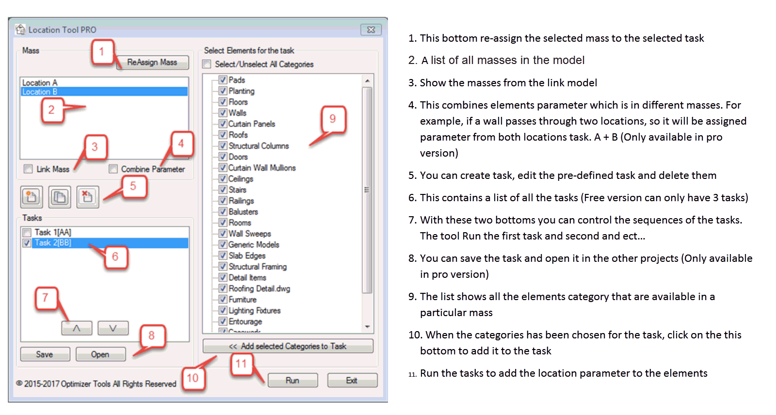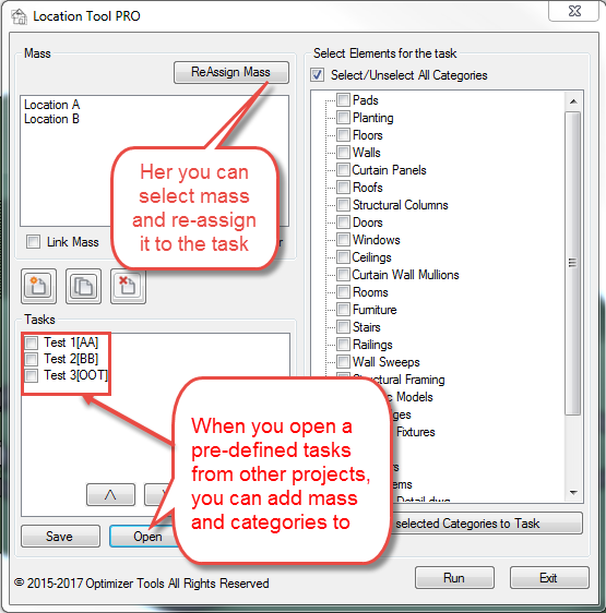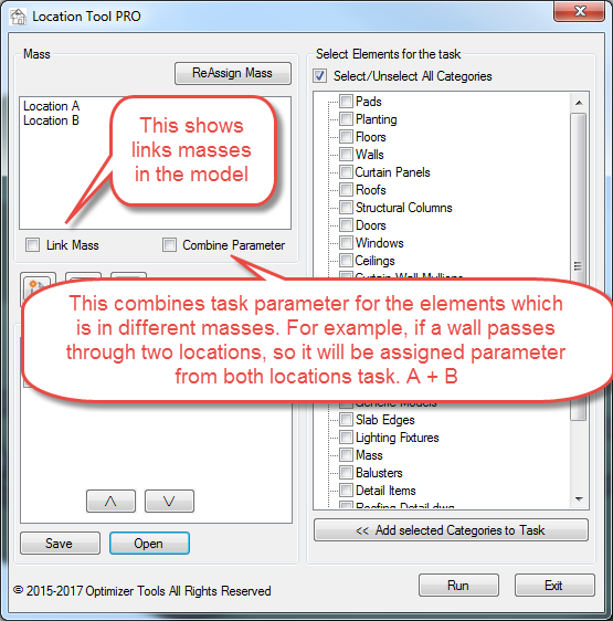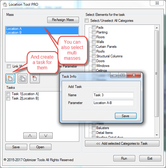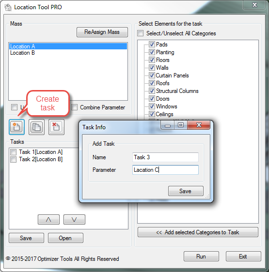 The user makes locations with masses in the model. The tool can register the mass in the model and all the categories contained in the selected mass. The user can now create tasks and decide which parameter to add to the elements. After clicking on Run the parameter is added to the selected categories.