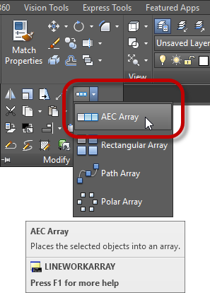 The AecLineworkArray command can be found on the Home ribbon tab, on the Modify panel flyout, by selecting the AEC Array tool from the Array flyout. If the AEC Array tool is not displayed on the Array flyout, select the right side of the split button (down arrow icon) to deploy the flyout and choose the AEC Array tool.