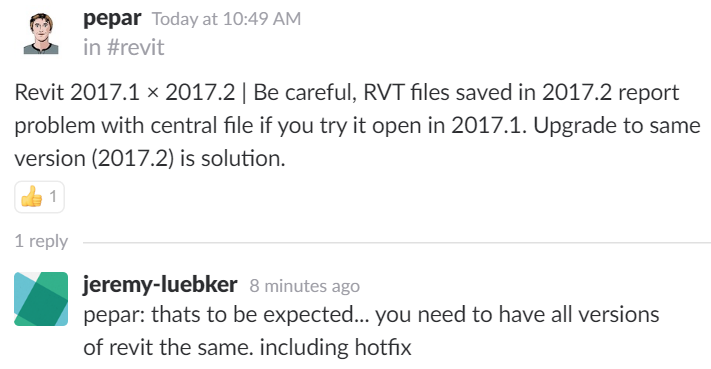 This has been a ‘best practice’ rule for a while now, but it still applies, even in 2017. You should not mix Revit 2017.1 and 2017.2 on a single Central File.