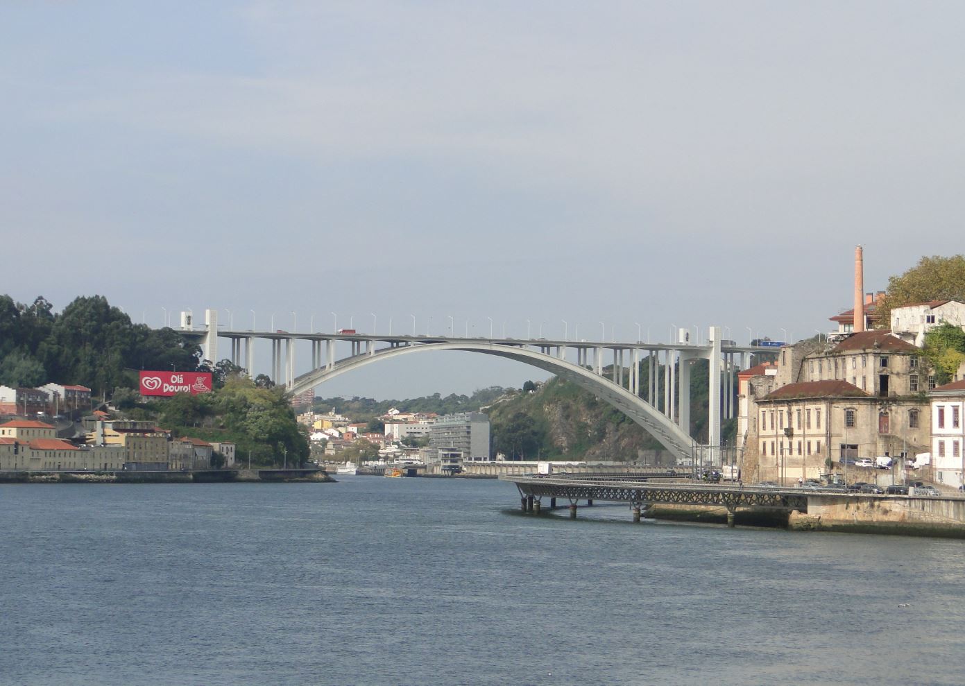 There are two beautifully engineered bridges here: one high, soaring concrete curve, spanning the steep banks of the Duoro; one low, sweeping steel curve, skimming over the water. The view is downstream, towards the sea, and behind the…