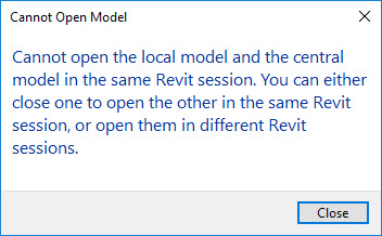 Keep in mind that no files were actually open at the moment. I was looking at the Recent Files list yet when I attempted to create a new local file for the project I just used Insert From File on the message popped up. This means that the file is technically still open in RAM as far as Revit is concerned, it’s just not open for me to interact with.