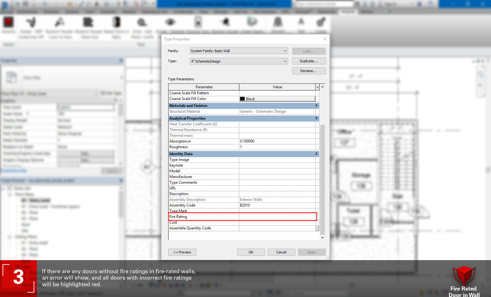 This Amplify Rated Doors in Walls add-in goes through all walls in a project, and if there are any fire-rated walls containing doors without a fire-rating, a warning is displayed and all incorrectly-rated doors are marked red. This allows the user to quickly see within the project itself if there are any doors with incorrect fire-ratings.