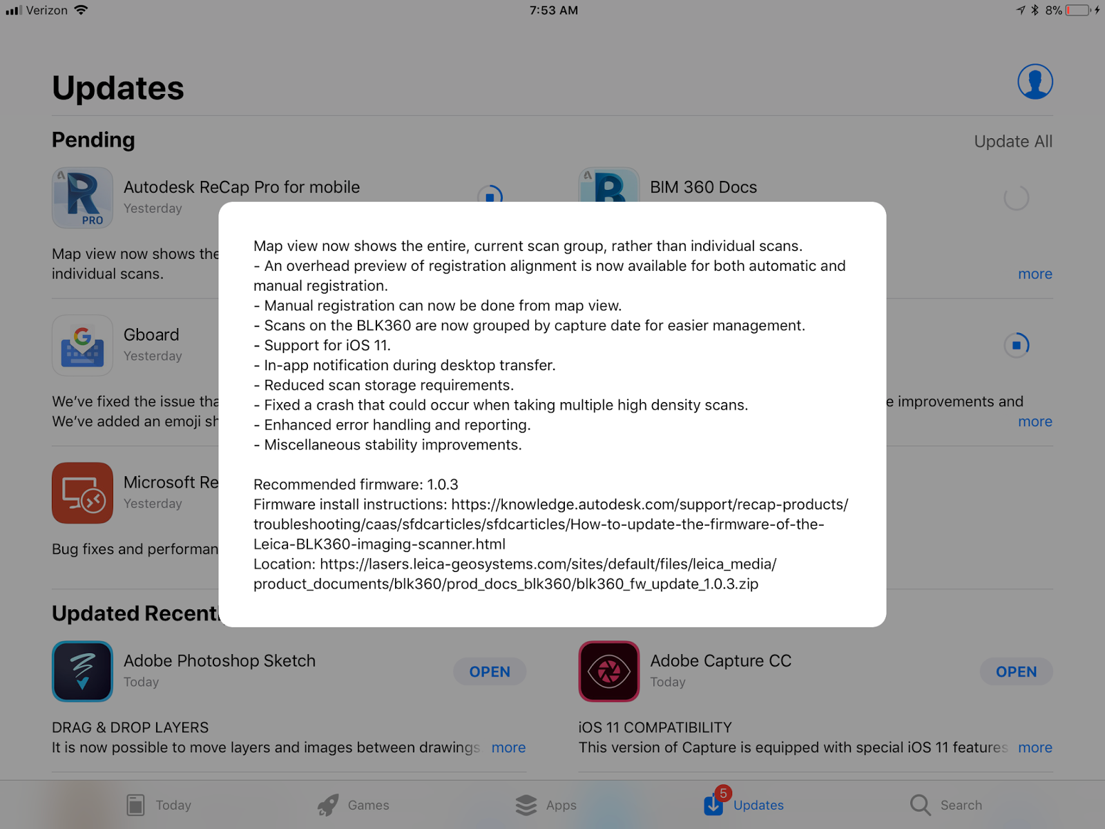 Several new enhancements have been made to the ReCap Pro for Mobile App. Go download it now! All these enhancements are recommended to run on the BLK360 Firmware 1.0.3 and on the newly released version of ios11. The firmware update is available here. The steps to install are included in the download.