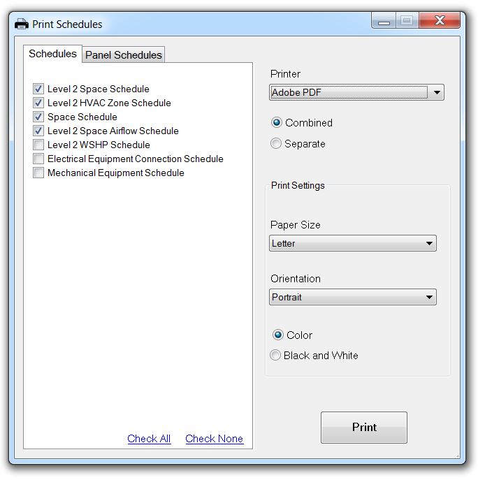 Prints schedules and panel schedules by printer or exports them to PDF.