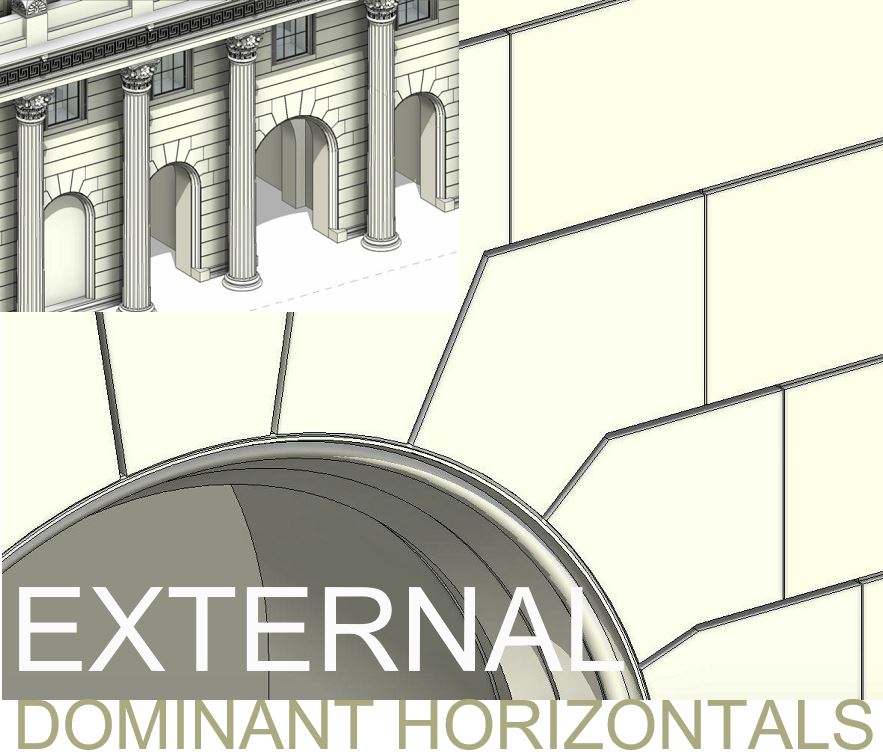 I added rustication to the ground floor of this inner Facade, giving equal weight to horizontals and verticals. These are loadable, wall-hosted families. Just a stick-on veneer. Maybe we will rethink that later, but for now it’s a quick fix.