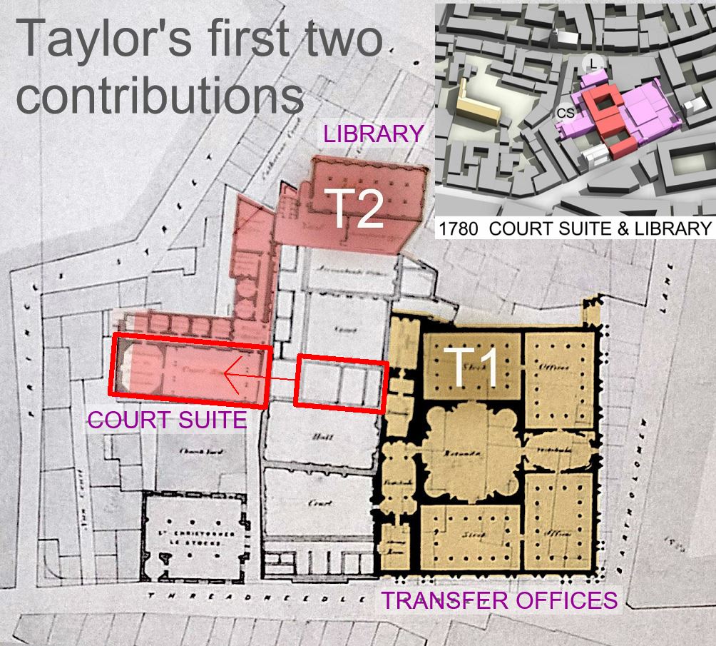 let’s get back to the story of the Bank’s evolution. First we have Sampson’s bank, then Taylor extends to the east so the Transfer business can move out of the Entrance block. Taylors second intervention projects the Court Suite out to the West and adds a library at the back.
