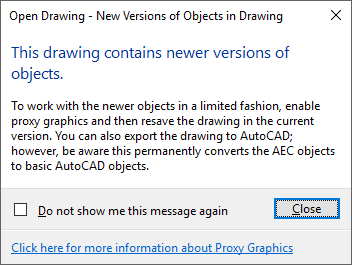 Had a support request today for the error dialog shown above, from someone working on a file in AutoCAD® Architecture 2016, who was trying to use a Wall Tool when the error occurred. That was all I was initially told, and “Unspecified error” is not terribly helpful. I asked the user to verify what AutoCAD profile was current and whether the problem was just with one file, or all files. In the course of responding, the user provided additional information. The problem was with just this one file, which had been working properly earlier. The reason the Wall Tool was being used was to fix Walls that were now “faulty.” And when opening the file, this other dialog appears: