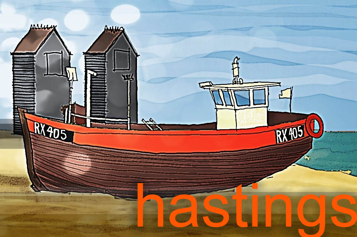 Hastings is a small town on the South Coast of England. It has a multi-layered history including the famous Battle in 1066 that allowed the Normans to wrest control from a Saxon elite. Fishing still plays an active role in the local economy and makes its presence felt along the Eastern shoreline in the form of black, weather-boarded storage towers and working vessels drawn up on the pebble beach.
