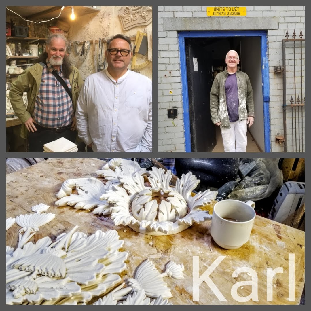 A trip to Burnley to visit Karl Claydon, master plasterer. Posing with my cousin in his workshop, Karl at the door saying farewell. An ornate ceiling rose in process of assembly on his bench.