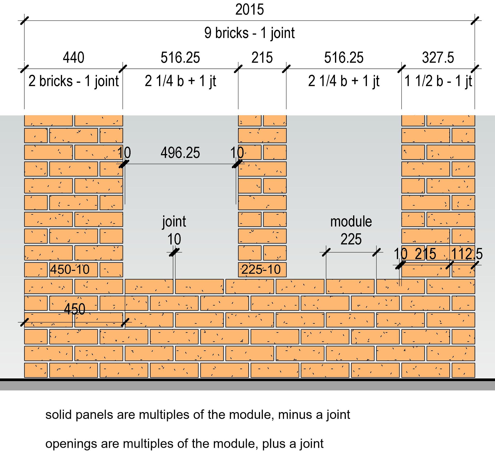 Modular sizing is especially relevant to facework. Where the wall is to be plastered, and/or the bricks are highly irregular in size, the modular approach is less relevant.