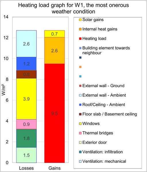 PHPP has a graph to display the heat gains and losses for the space heating demand approach, which is a very useful design tool to help understand the design, including which heat transfer mechanisms are significant or trivial.There’s not currently an equivalent graph for peak heating load.