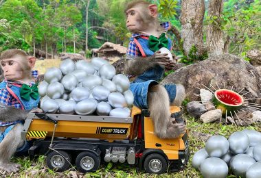 Monkey Baby Bim Bim rides a car and plays in the playground with...